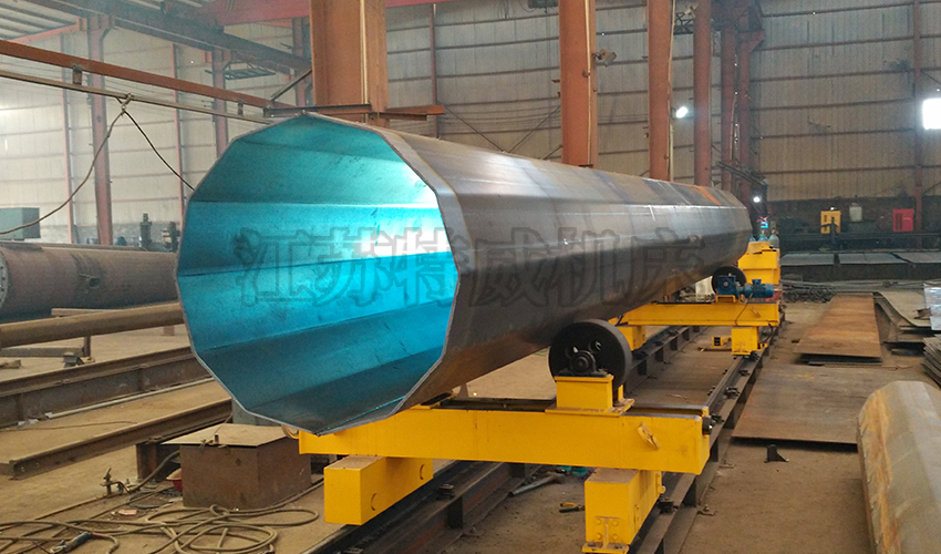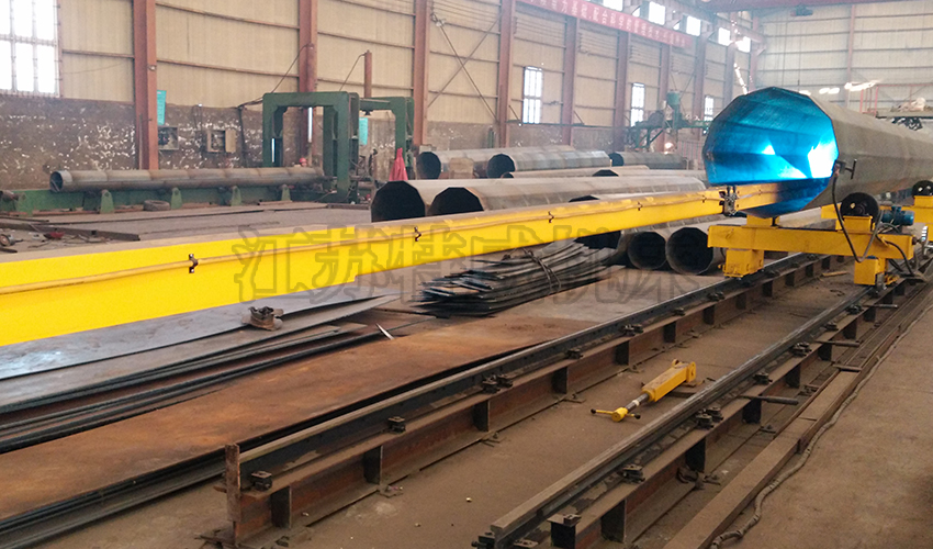 立柱和橫臂均為長方形梁,雙軌式,立柱和橫臂焊后經退火去應力處理再進行機械精加工,保證較高的進度要求,立柱和橫臂的上下左右端部都設置行程限位開關,確保使用安全可靠。導向座為箱形結構,上下、左右均有滑輪座,滑輪座采用偏心軸結構,導向輪和橫臂、立柱上的導軌為矩行面接觸,導向輪偏心可調,能保證橫臂的水平伸縮和垂直伸縮都能運行平穩,無抖動形象。后端通過滑輪與立柱相連,前端通過滑輪與橫臂相連。橫臂伸縮、升降與立柱回轉極限位置均由行程開關控制。