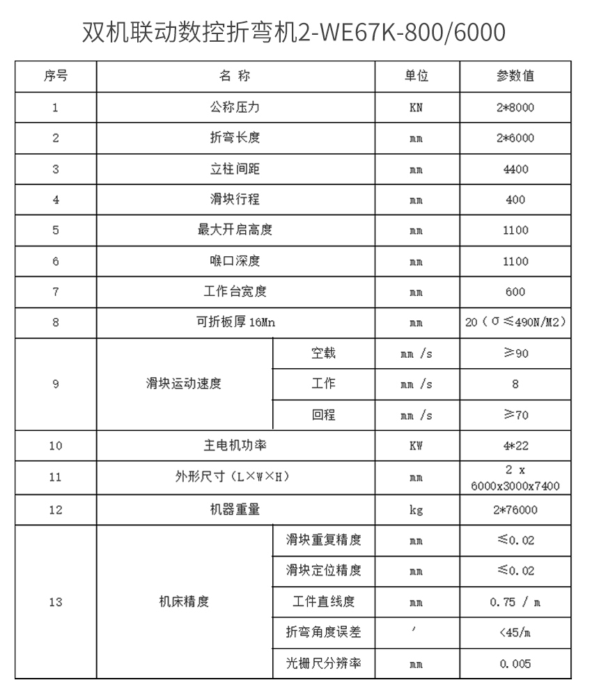 選用兩臺WE67K系列同規格主機,配有雙機聯動同步裝置,可加工特長工件、精度高;兩臺機器亦可單獨使用,提高生產效率。下工作臺選配有自動液壓變形補償機構或機械補償機構,可配用荷蘭Delem DA52、DA56、DA65W、DA69或瑞士Cybelec DNC84、DNC1200折彎機數控系統。